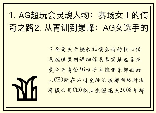 1. AG超玩会灵魂人物:赛场女王的传奇之路2. 从青训到巅峰:AG女选手的荣耀征途3. 电竞玫瑰绽放时:记AG战队核心女将的封神时刻神时刻